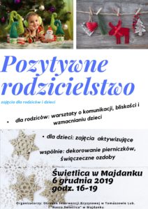 Zapraszamy rodziców z dziećmi z gminy Tomaszów Lubelski na mikołajkowe warsztaty pn. „Pozytywne rodzicielstwo” organizowane przez Ośrodek Interwencji Kryzysowej w Tomaszowie Lubelskim i świetlicę w Majdanku. Pierwsza część zajęć będzie realizowana oddzielnie. Rodzicom zaproponujemy warsztaty poświęcone komunikacji z dzieckiem, bliskości i wzmacnianiu dziecka, zaś dzieciom – zajęcia aktywizujące i kreatywne. Następnie wszystkich razem zaprosimy do wspólnego przygotowywania ozdób świątecznych i dekorowania pierniczków. Zajęcia są bezpłatne. Potrzebne jest jednak wcześniejsze zgłoszenie (bądź w Ośrodku bądź w świetlicy). Do zobaczenia w ten mikołajkowy wieczór!