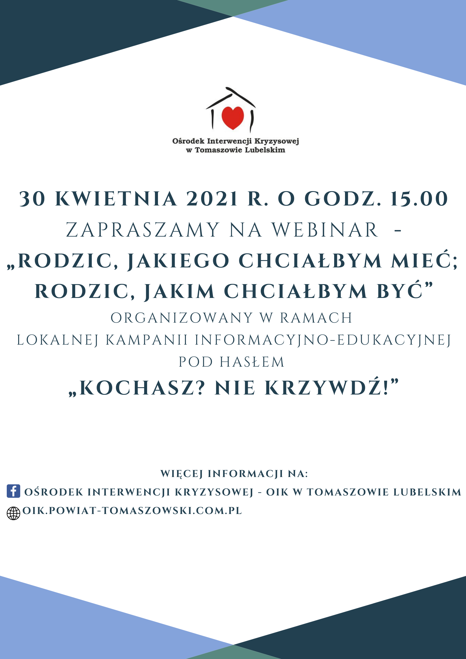 Przypominamy, że w dniu dzisiejszym – kończąc lokalną kampanię „Kochasz? Nie krzywdź!” – zapraszamy Państwa na webinar prowadzony przez psychologa Ośrodka Interwencji Kryzysowej pt. „Rodzic, jakiego chciałbym mieć; rodzic, jakim chciałbym być”. Godzinne spotkanie zacznie się o godzinie 15.00 pod linkami: