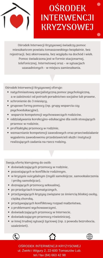 Czym się zajmujemy? 2021-09-102021-09-10 przez oik Przypominamy, czym zajmuje się Ośrodek Interwencji Kryzysowej w Tomaszowie Lubelskim i do kogo kieruje swoją pomoc. FacebookShare on XLinkedInWhatsAppEmailCopy Link