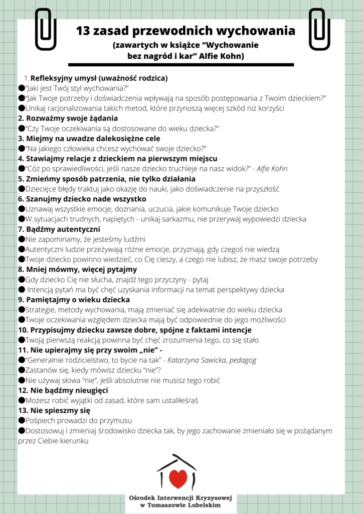 13 zasad przewodnich wychowania 2021-11-25 przez oik Poniżej znajdą Państwo streszczenie zasad, o których mogli Państwo posłuchać w video podcaście nagranym przez psycholog naszego Ośrodka z okazji Międzynarodowego Dnia Zapobiegania Przemocy wobec Dzieci. FacebookShare on XLinkedInWhatsAppEmailCopy Link