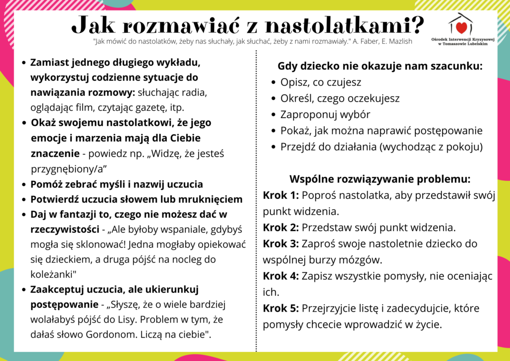 „Trudno się dziś dogadać z młodymi” – powie wielu dorosłych. Wiąże się to z nagromadzoną frustracją, a nawet agresją wymierzoną w tych młodych, dorastajacych ludzi, z którymi nie możemy sie porozumieć, czy też na których nie możemy „wpłynąć”. Jak zatem rozmawiać z nastolatkami, by mieć poczucie, że się choć trochę lepiej rozumiemy i wciąż jesteśmy sobie bliscy? By wreszcie -nie walczyć z własnym dzieckiem? Opowie o tym psycholożka z Ośrodka Interwencji Kryzysowej (Ośrodek Interwencji Kryzysowej – OIK w Tomaszowie Lubelskim) pod następującym linkiem: