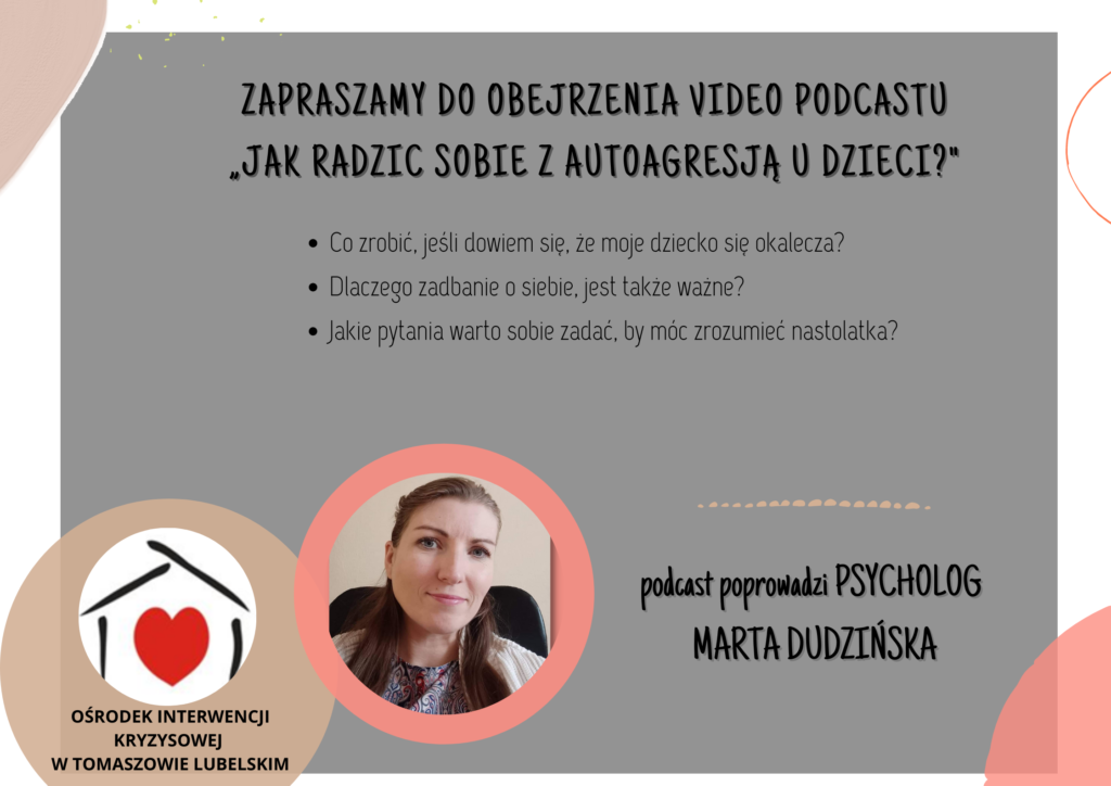 Zapraszamy Państwa na ostatnie nagranie z cyklu adresowanego do rodziców mającego na celu wzmacnianie kompetencji rodzicielskich. Dotyczy ono radzenia sobie w sytuacji, gdy okazuje się, że nasze dziecko się okalecza. Podcast psycholożki z Ośrodka Interwencji Kryzysowej w Tomaszowie Lubelskim obejrzą Państwo pod następującym linkiem: