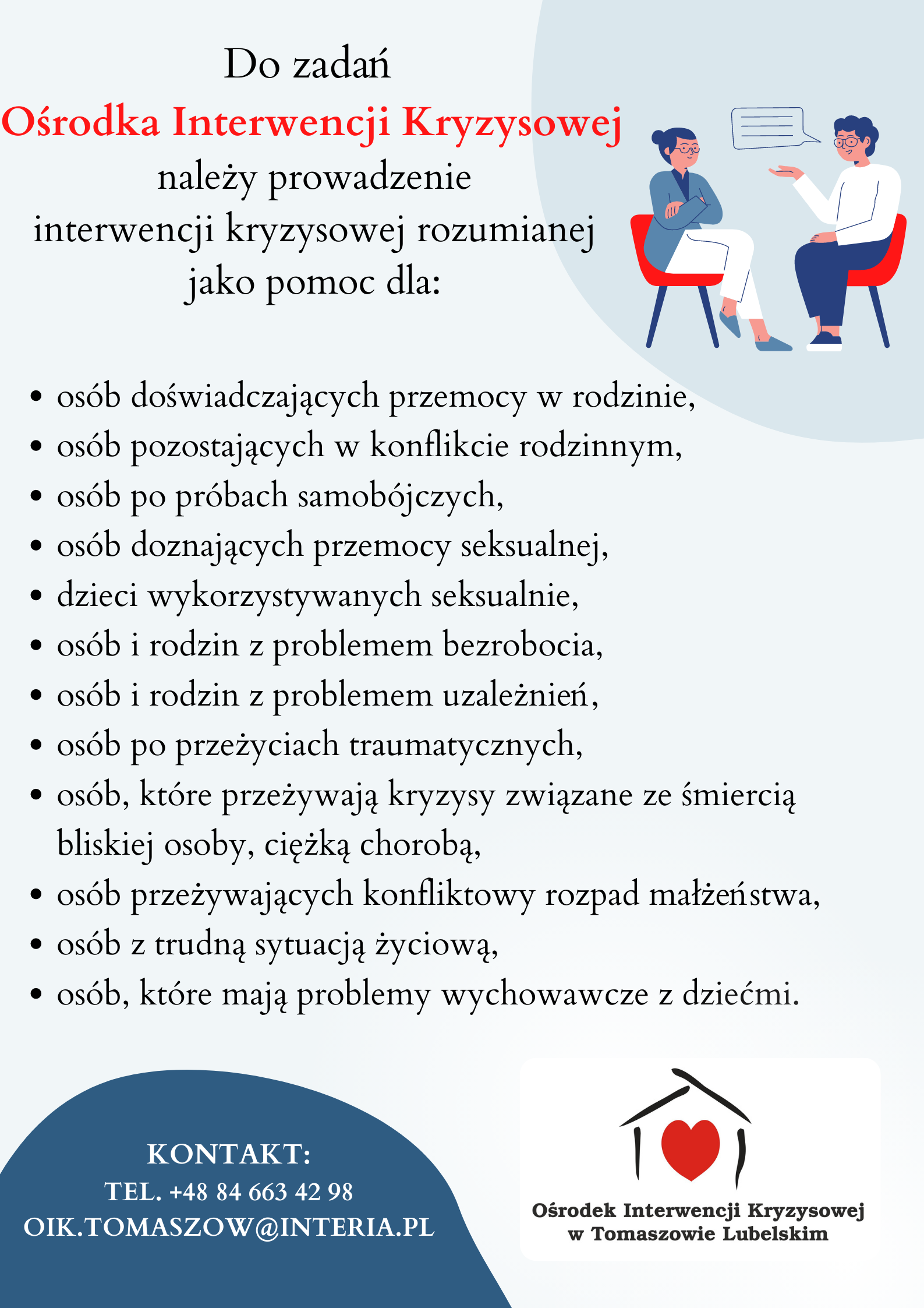 Przypominamy, że Ośrodek Interwencji Kryzysowej świadczy pomoc psychologiczną, a w uzasadnionych przypadkach także poradnictwo prawne i socjalne w sytuacjach, w których nasze dotychczasowe możliwości, strategie i działania okazują się niewystarczające. Celem interwencji kryzysowej jest przywrócenie równowagi psychicznej i umiejętności samodzielnego radzenia sobie, a dzięki temu niedopuszczenie, by reakcja kryzysowa pogłębiała się, a następnie przeszła w stan chronicznej niewydolności psychospołecznej. Pomoc świadczona jest bezpłatnie i bez względu na posiadany dochód.