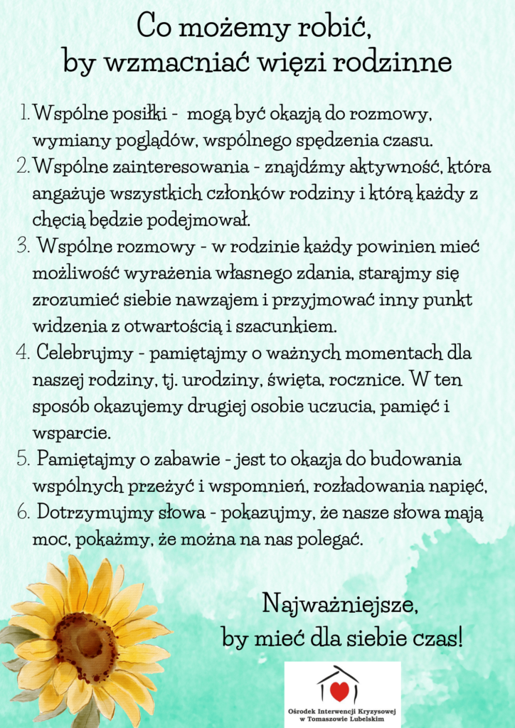 Dzień praw rodziny to dobry czas, by przypomnieć sobie, jak ważną rolę pełni rodzina – nie tylko w społeczeństwie, ale przede wszystkim w naszym życiu. Każdy z nas chciałby stworzyć szczęśliwą rodzinę – podstawą tworzenia powinna być bezwarunkowa miłość, wzajemny szacunek i wsparcie. Stworzenie rodziny, która jest wspólnotą i daje poczucie bezpieczeństwa, spoczywa przede wszystkim na barkach nas samych. Choć czasem bywa to trudne, m.in. ze względu na szybkie tempo życia, odmienne poglądy, temperamenty, potrzebę autonomii – to jednak możemy do naszej codzienności wprowadzić takie aktywności, dobre nawyki czy rutyny, które pozwolą nam podtrzymywać więzi i zbudować fundamenty, które trudno będzie zburzyć.