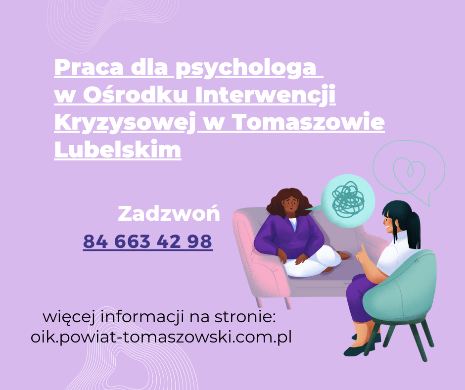 Ośrodek Interwencji Kryzysowej zatrudni psychologa – posiadającego doświadczenie w zakresie przeciwdziałania przemocy domowej i pomocy osobie w kryzysie lub nieposiadającego doświadczenia zawodowego, ale za to gotowego na podnoszenie swoich kwalifikacji podczas specjalistycznych szkoleń. Wymiar czasu pracy do uzgodnienia. Tu link do ogłoszenia: Praca-dla-psychologa-w-OIK_luty_2024