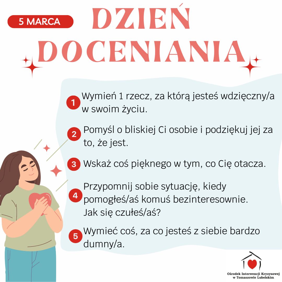 5 marca – Dzień Doceniania 2024-03-05 przez oik Praktykowanie wdzięczności do jeden z elementów budowania odporności psychicznej. A zatem doceniajmy: siebie, innych i to dobro – choćby drobne, które nas w życiu spotyka. FacebookShare on XLinkedInWhatsAppEmailCopy Link
