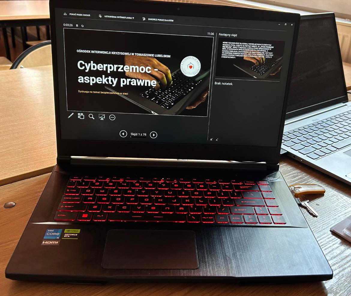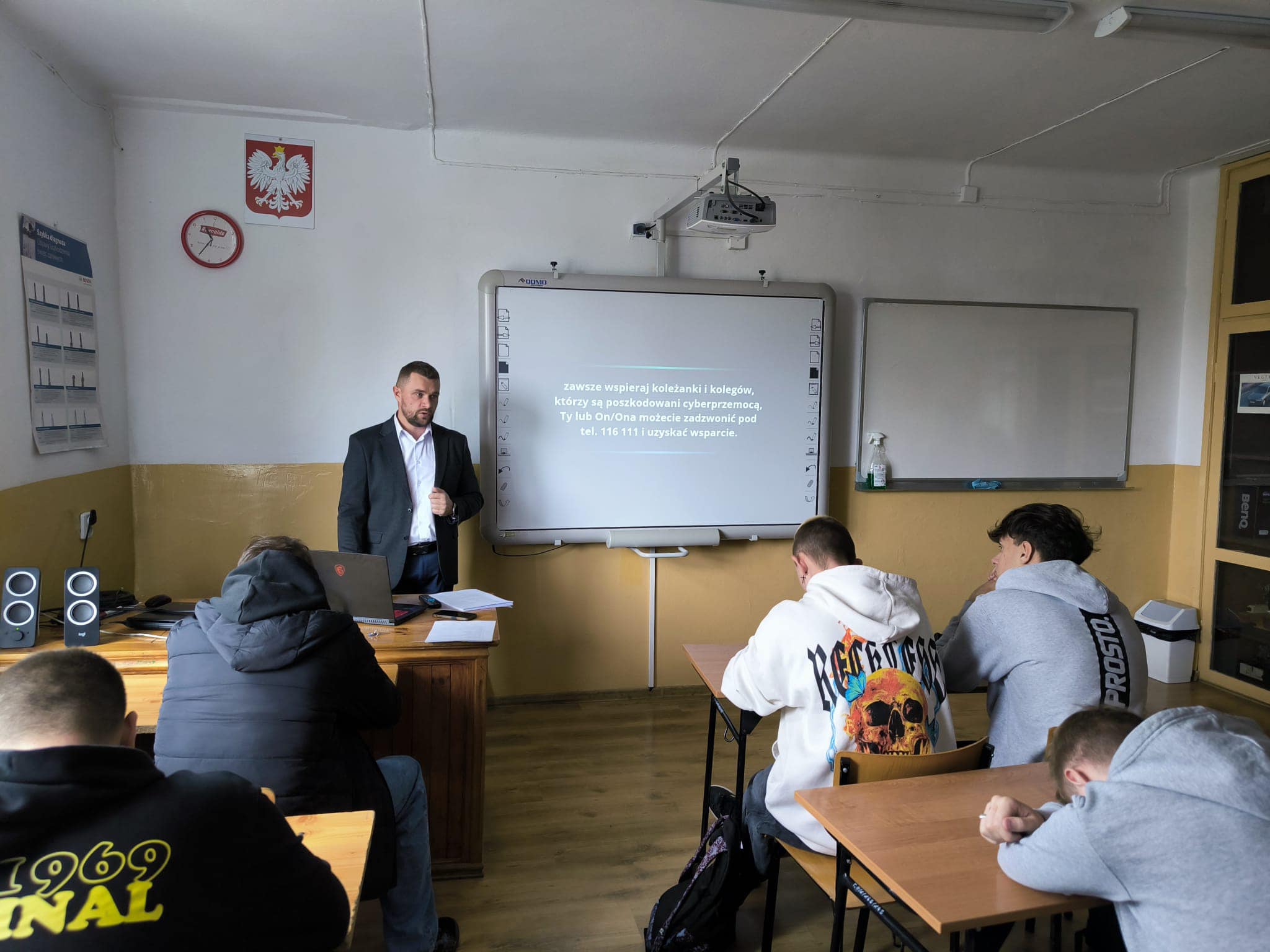 W dniu 3 października 2024r. w Zespole Szkół Techniczno-Motoryzacyjnych im. Jarosława Dąbrowskiego w Tomaszowie Lubelskim przeprowadzono spotkanie szkoleniowe z zakresu aspektów prawnych związanych z cyberprzemocą.
