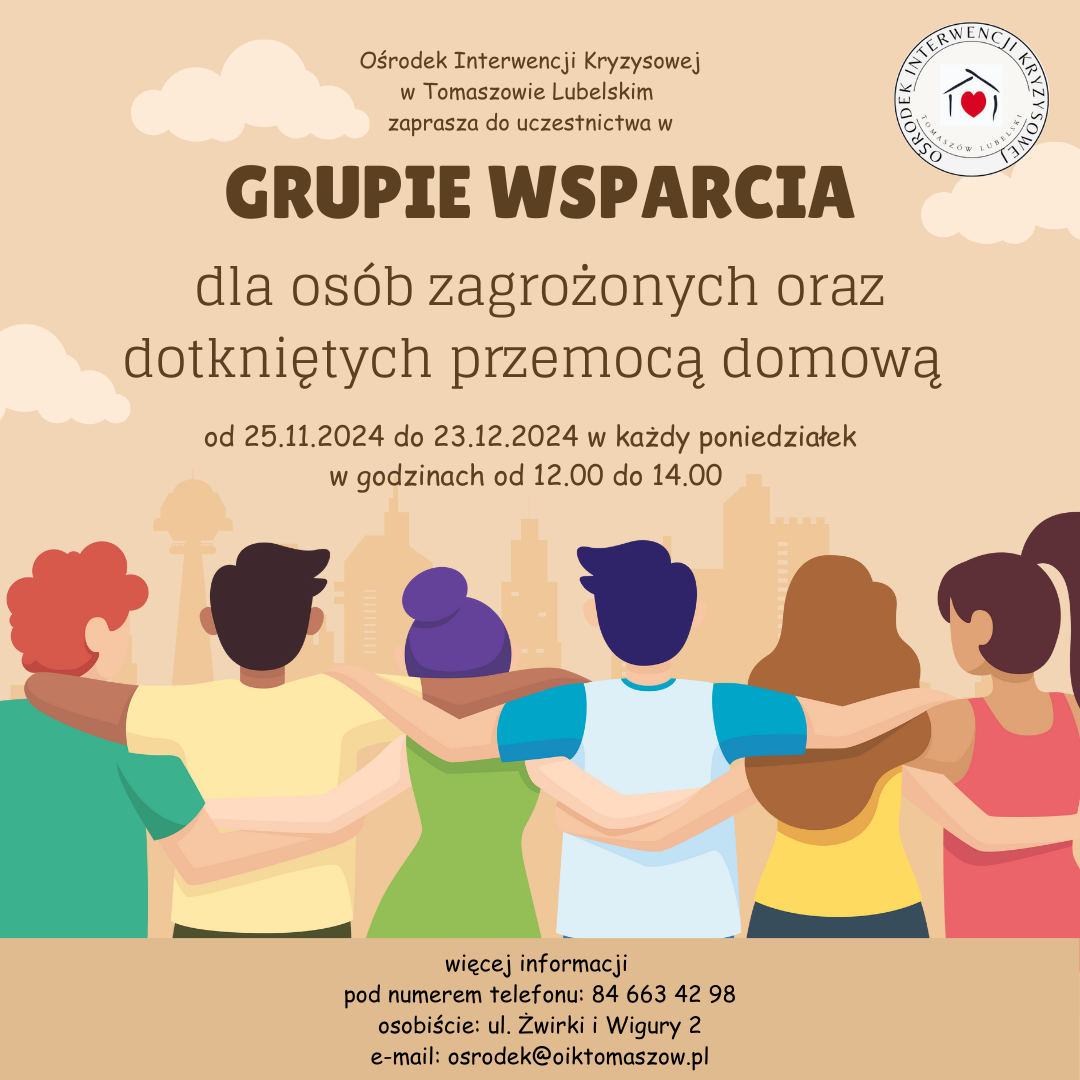 Ośrodek Interwencji Kryzysowej w Tomaszowie Lubelskim zaprasza na BEZPŁATNY cykl spotkań warsztatowych w formie GRUPY WSPARCIA dla osób zagrożonych oraz dotkniętych przemocą domową.