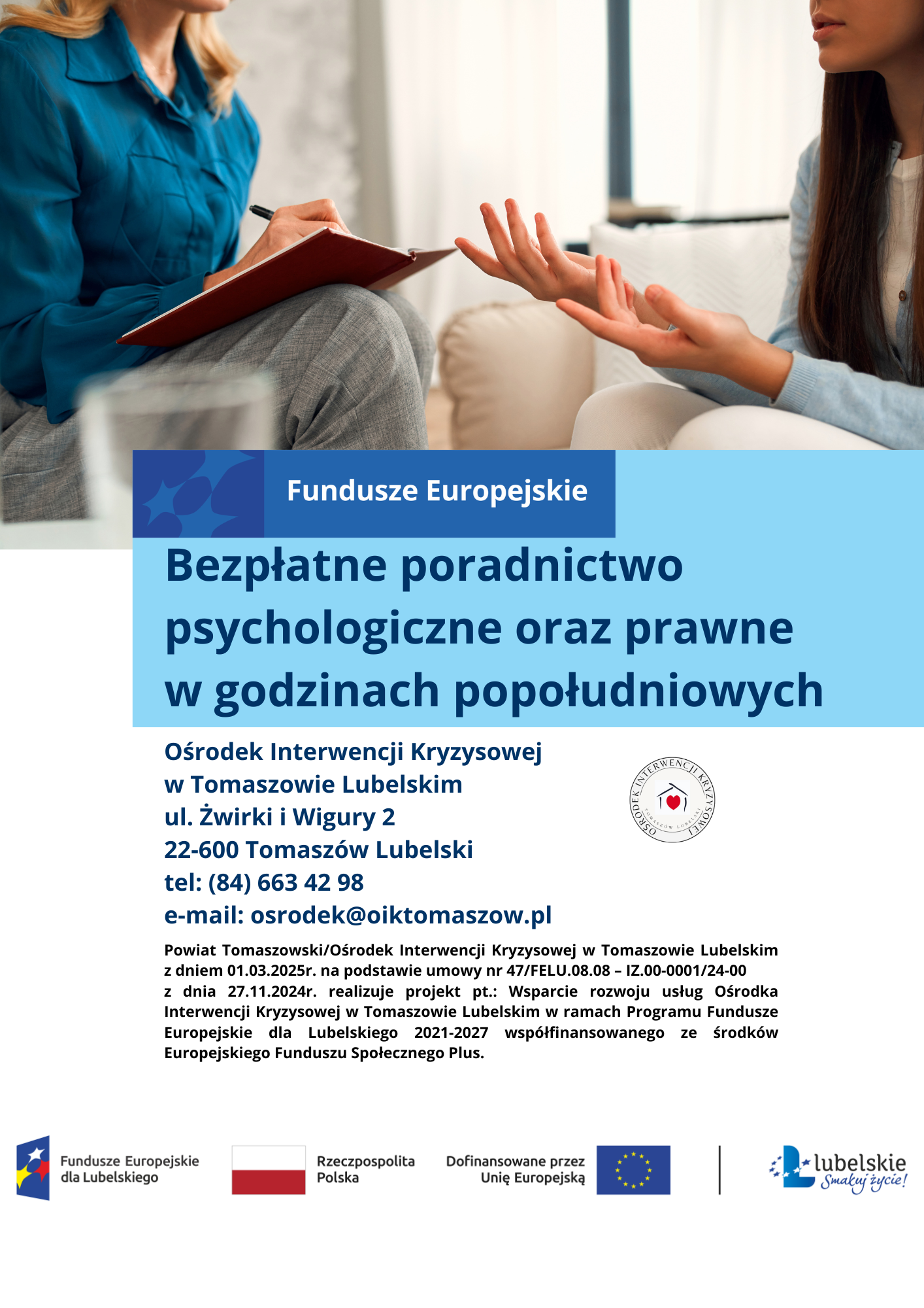 Ośrodek Interwencji Kryzysowej w Tomaszowie Lubelskim z dniem 01.03.2025r. na podstawie umowy nr 47/FELU.08.08 – IZ.00-0001/24-00 z dnia 27.11.2024r. rozpoczął realizację projektu pt.: Wsparcie rozwoju usług Ośrodka Interwencji Kryzysowej w Tomaszowie Lubelskim w ramach Programu Fundusze Europejskie dla Lubelskiego 2021-2027 współfinansowanego ze środków Europejskiego Funduszu Społecznego Plus.